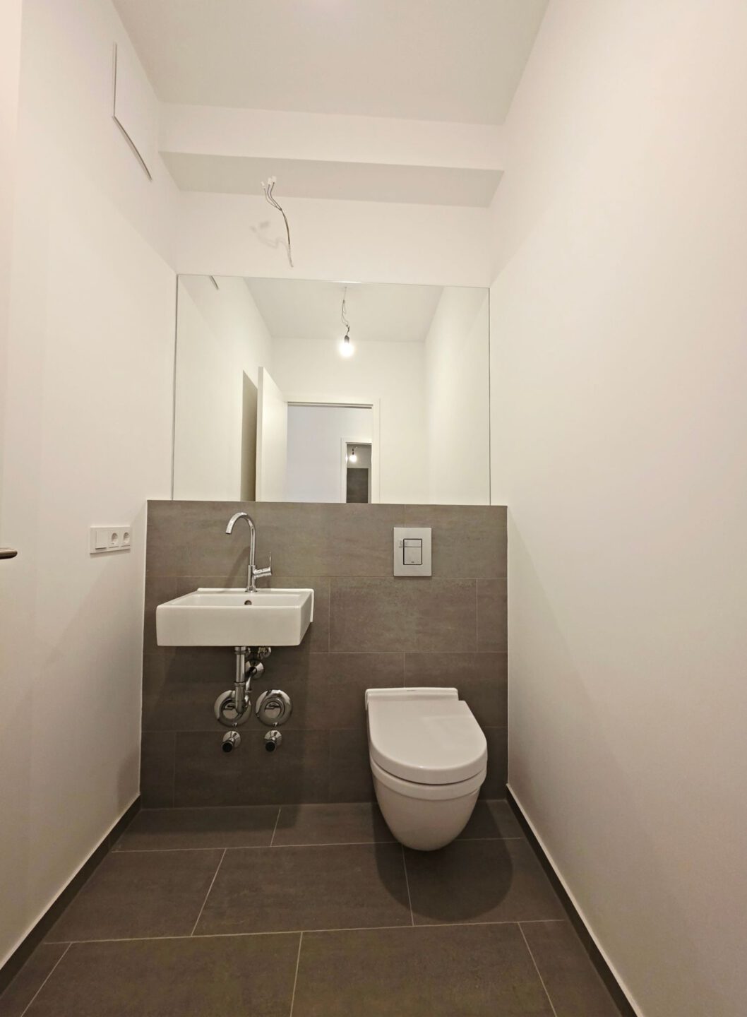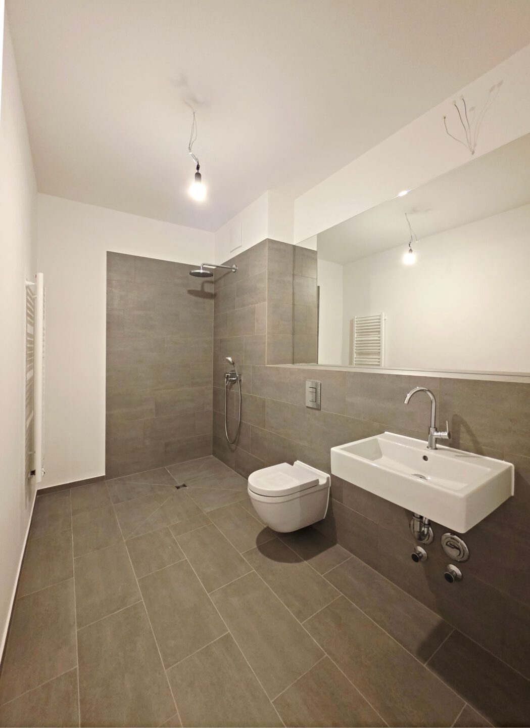 Auch in den Bädern steht zeitloser Materialeinsatz im Vordergrund. Großformatige Fliesen werden an Wand und Boden angebracht. Zurückhaltend gestaltete Badkeramik stehen für klare, geometrische Formen. Ebenso zeitlos sind die Badarmaturen aus Edelstahl mit ihren puristischen Hebelgriffen. Die bodengleichen Duschen sorgen so für Komfort.