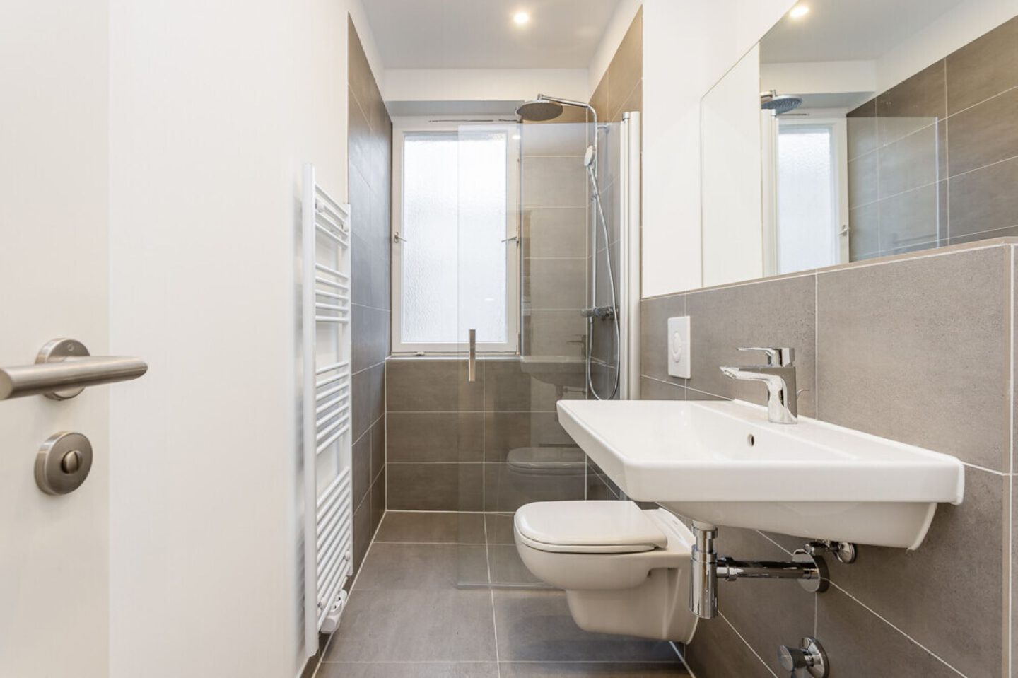 Neuangelegtes, hochwertig gefliestes Badezimmer mit modernen Markenarmaturen