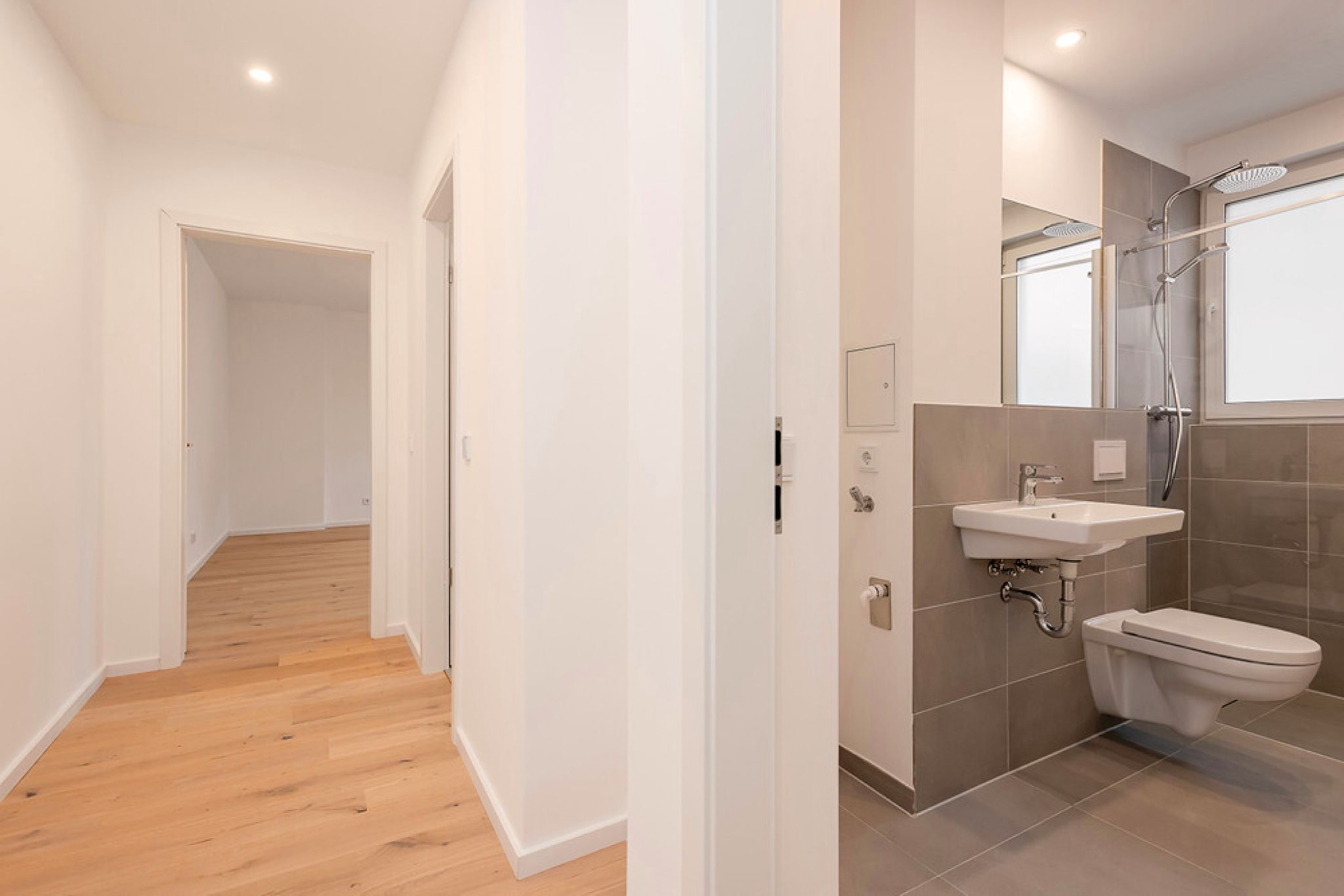 Die Wohnung wurde kürzlich umfassend modernisiert: Das Badezimmer wurde hochwertig ausgestattet, u. a. mit bodengleicher Dusche und Rainshower, Sanitärkeramik von Kaldewei sowie Villeroy & Boch, Armaturen von Grohe und Feinsteinzeugfliesen (30 × 60 cm). Zudem wurden die Wände gespachtelt, Echtholzparkett in Dielenoptik verlegt und die Elektrik erneuert. Die Deckenhöhe beträgt in den nicht abgehängten Bereichen ca. 2,67 m. Die Warmwasserversorgung erfolgt über einen Durchlauferhitzer.