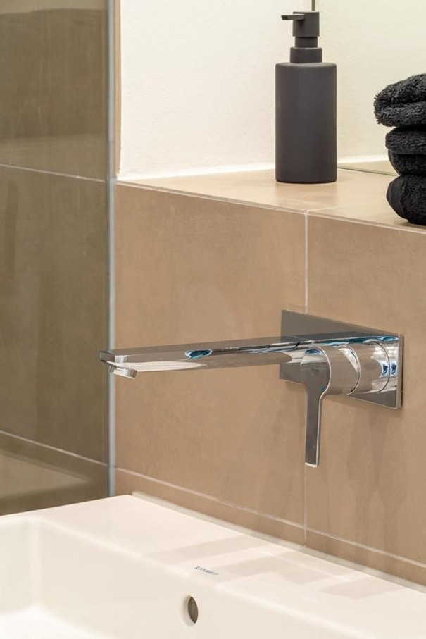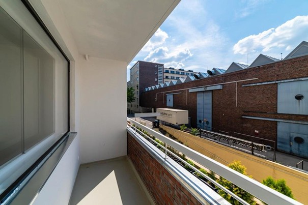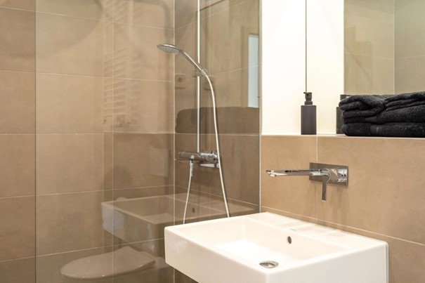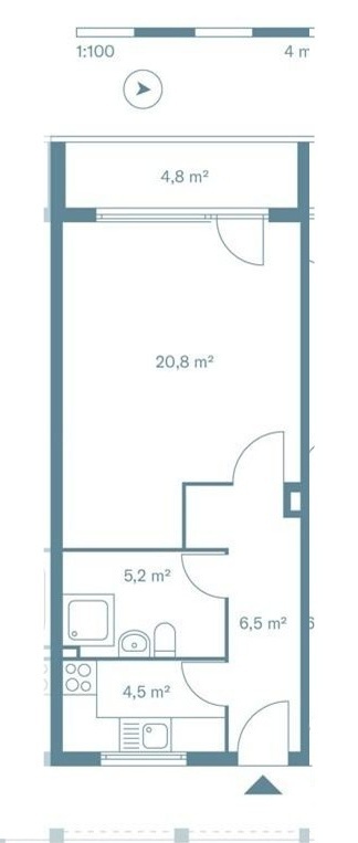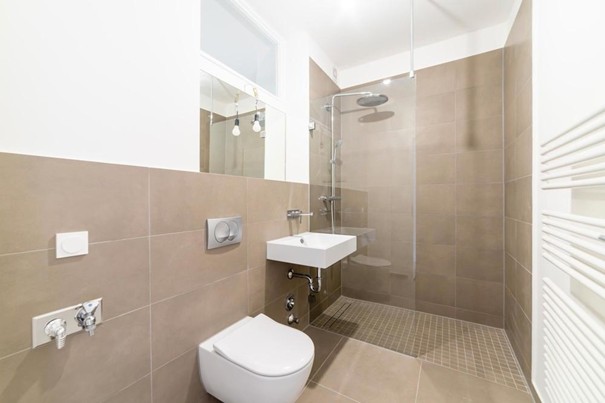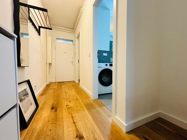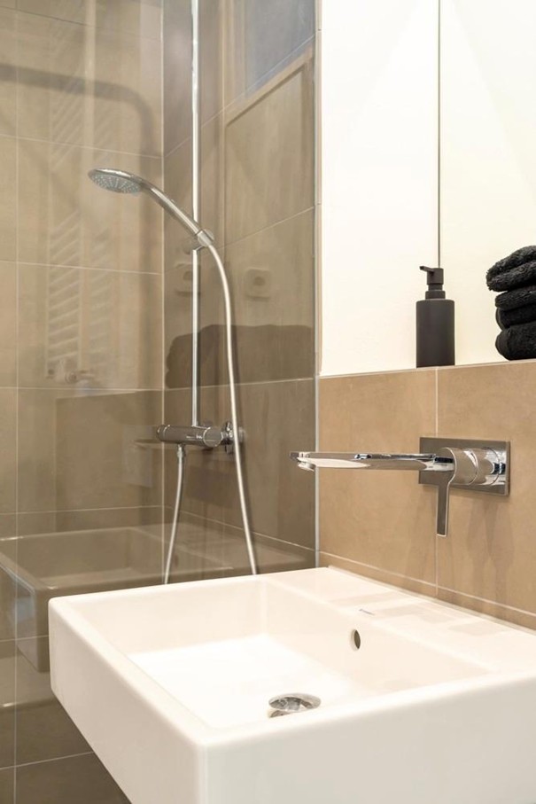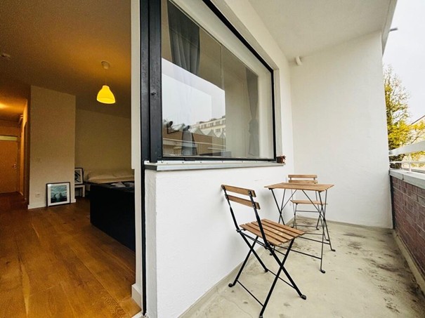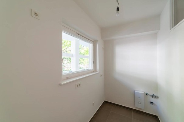 Man betritt die Wohnung durch einen Flur, von dem die Küche, das Duschbad mit Waschmaschinenanschluss und der große Wohnraum abgehen. Hieran schließt sich auch die großzügige nach Westen ausgerichtete Loggia an. Der Wohnraum bietet eine praktische Nische, die sich hervorragend eignet, um das Bett zu separieren. Im Flur und im Wohnzimmer ist geweißtes Eichenparkett in Dielenoptik verlegt. Das Duschbad wurde mit einer bodengleichen Dusche mit Rainshower ausgestattet, es verfügt über Villeroy & Boch und Kaldewei Sanitärkeramiken und Grohe Armaturen. In Bad und Küche wurden hochwertige Fliesen von Princess ceramic verlegt.