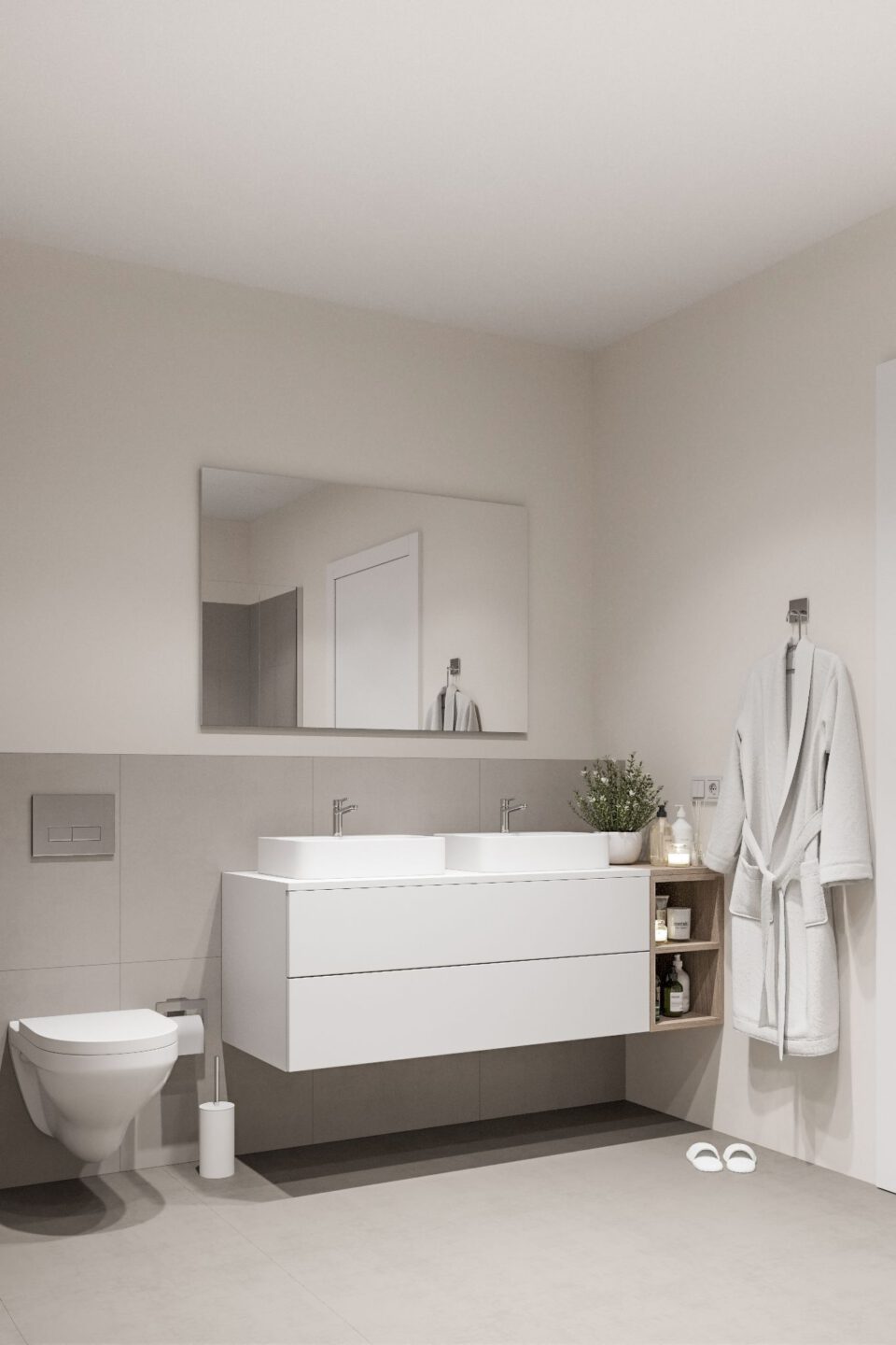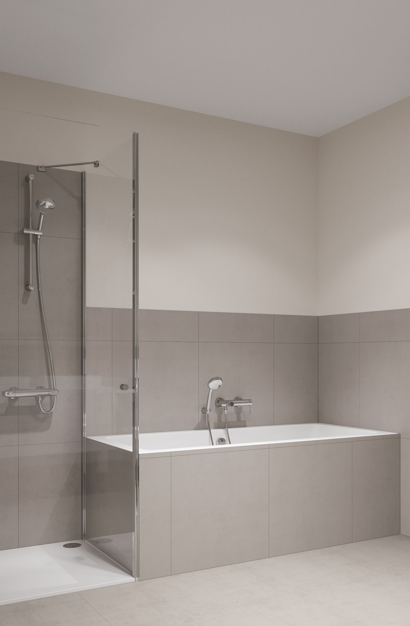 Bad: mit Wanne, Dusche und doppelten Waschbecken