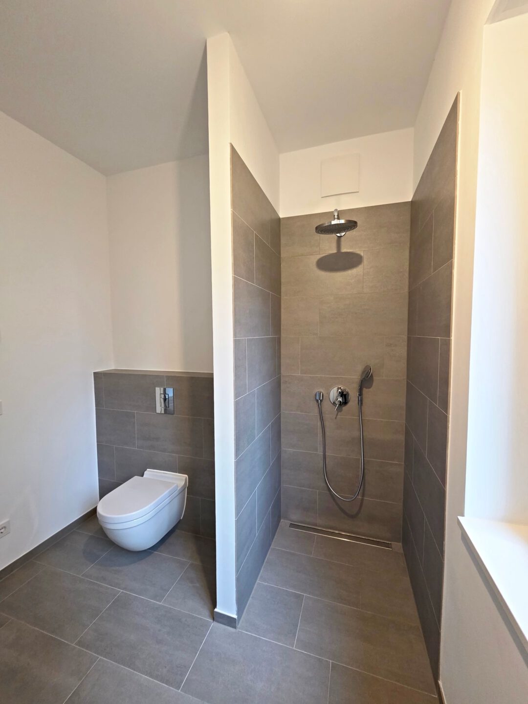 Auch in den Bädern steht zeitloser Materialeinsatz im Vordergrund. Großformatige Fliesen werden an Wand und Boden angebracht. Zurückhaltend gestaltete Badkeramik stehen für klare, geometrische Formen. Ebenso zeitlos sind die Badarmaturen aus Edelstahl mit ihren puristischen Hebelgriffen. Die bodengleichen Duschen sorgen so für Komfort.